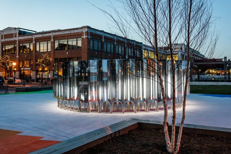 Playing with the ideas of reflection and refraction of light, Mirror Mirror’s interior and exterior are clad with a mirrored surface that reflects the surrounding environment in unexpected ways. Through a panoramic array of mirrors and sound-responsive lights, Mirror Mirror will visually blend the waterfront, the fabric of Old Town, and the activity of pedestrians in the new park..