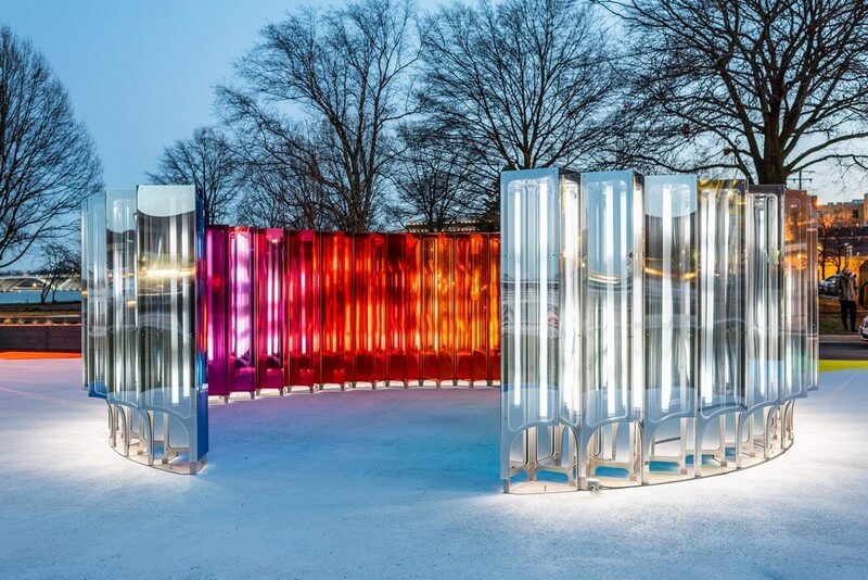 While the exterior is a monochromatic mirror that reflects the urban environment, the river and visitors themselves, the interior’s mirrored surface is tinted with the full color spectrum, providing another layer of vibrancy and interest. The artwork is also programmed to respond to sound with light, allowing visitors to interact with the artwork and affect its appearance using their voices and bodies.