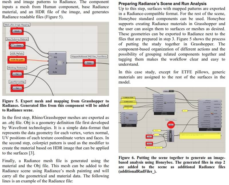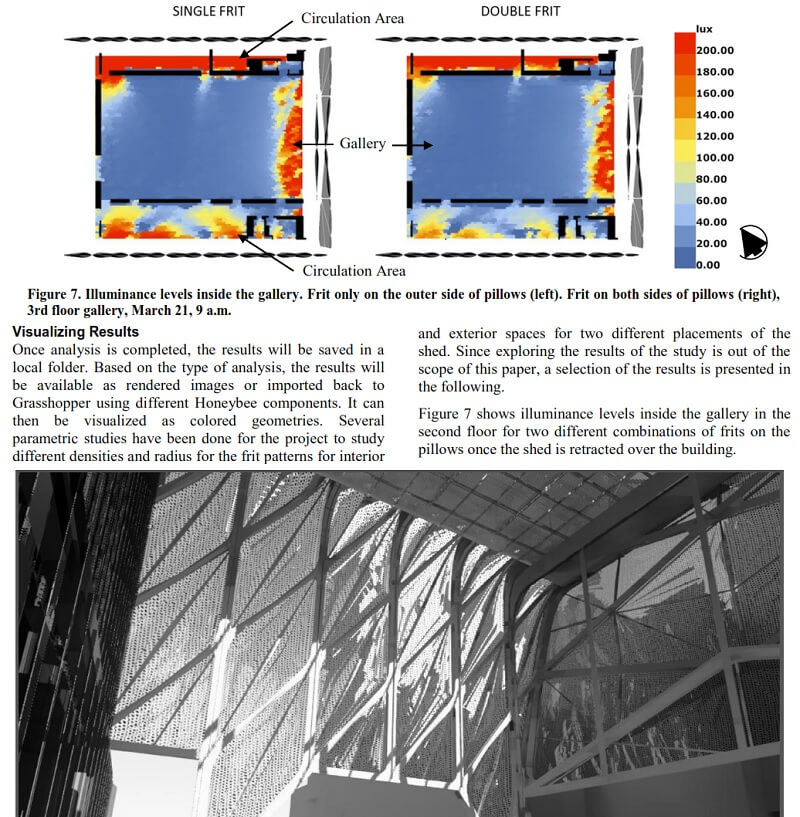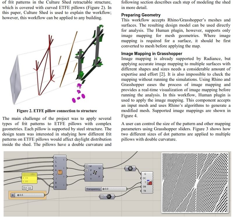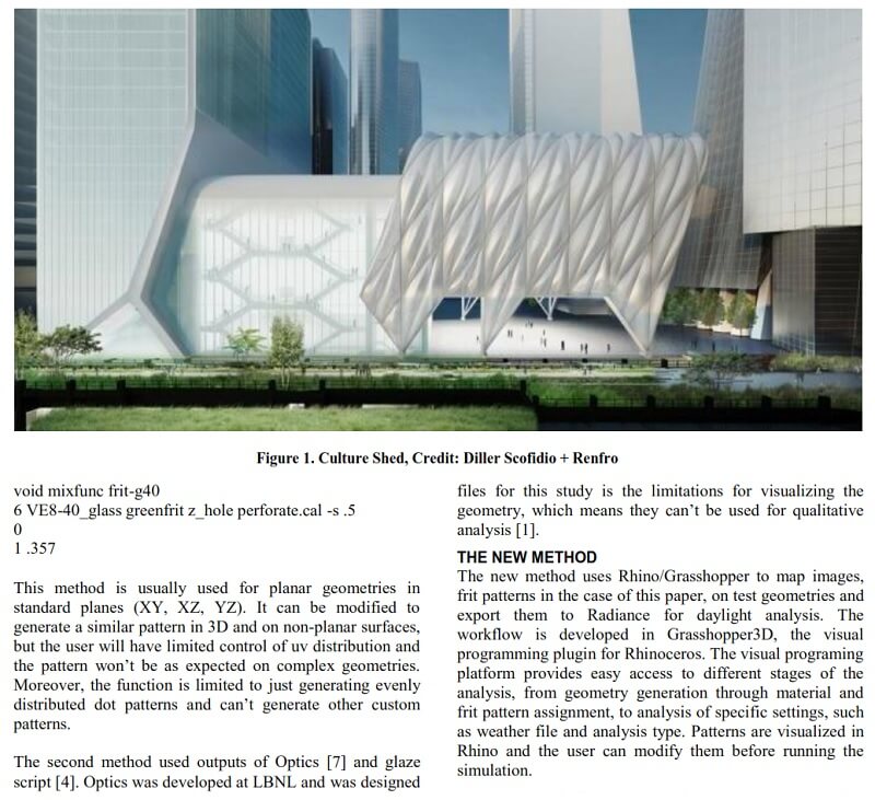 This paper by Mostapha Sadeghipour Roudsari and Anne Waelkens introduces a custom workflow for modeling frit patterns for daylight simulation on buildings, which streamlines quantitative and qualitative daylight analysis by using parametric modeling tools such as Grasshopper3D, in association with validated lighting rendering engine Radiance.