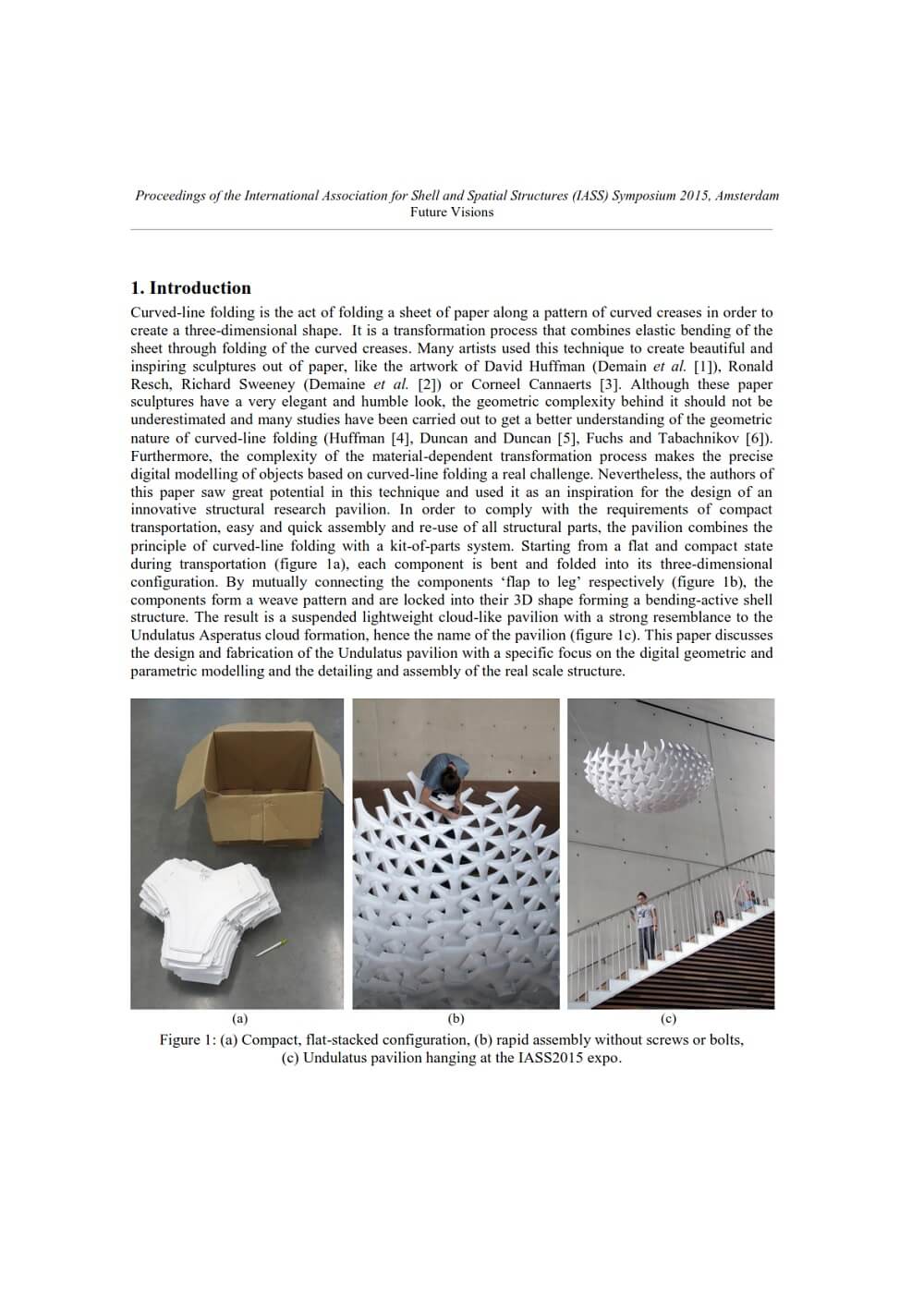 Curved-line folding is the act of folding a flat sheet of material along a curved crease pattern in order to create a three-dimensional shape. It is a creative and innovative way to produce lightweight and geometrically stiff components using only sheet materials. The pavilion presented in this paper by Stijn Brancart, Aline Vergauwen, Kelvin Roovers, Dimitri Van Den Bremt, Lars De Laet and Niels De Temmerman integrates this principle in a kit-of-parts system.