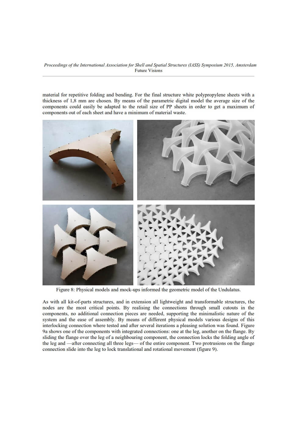 After being cut out of flat plates, the components get their 3D shape by folding them along a set of predefined curved lines. This deformed geometry, variable in its degree of bending, results in a structurally efficient ‘building block’ that can be combined into different structural configurations depending on its mode of assembly. The components form a weave pattern by connecting them ‘flap to leg’ respectively. As such, adjacent components lock each other into their rigid three-dimensional configuration and a modular shell structure is obtained.