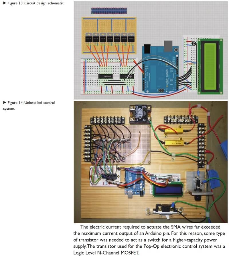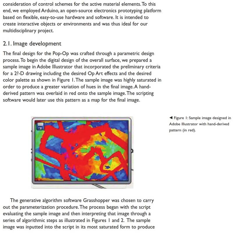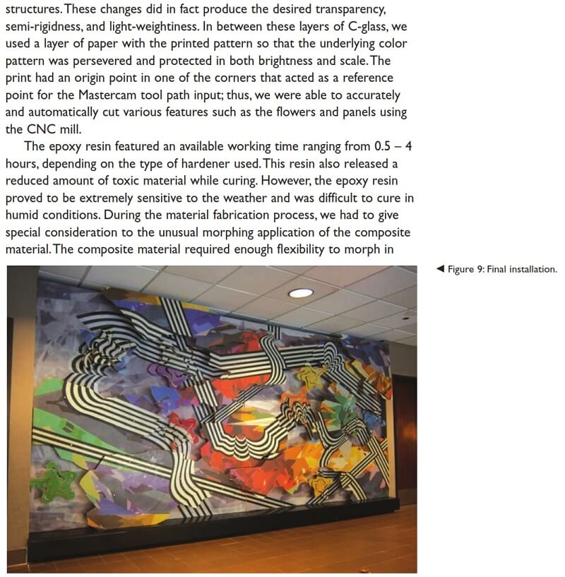 The incorporation of active materials comprised a unique aspect of this project: the investigation of surface movement through controlled and repeatable deformation of the composite structure using shape memory alloy (SMA) wiring technology. The integration of composite materials with SMA wiring and Arduino automation control resulted in an architectural wall that incorporated perceptual and actual motion.