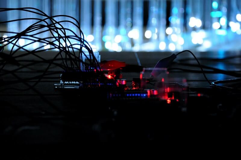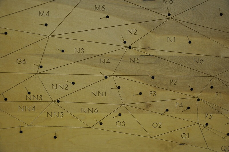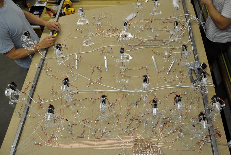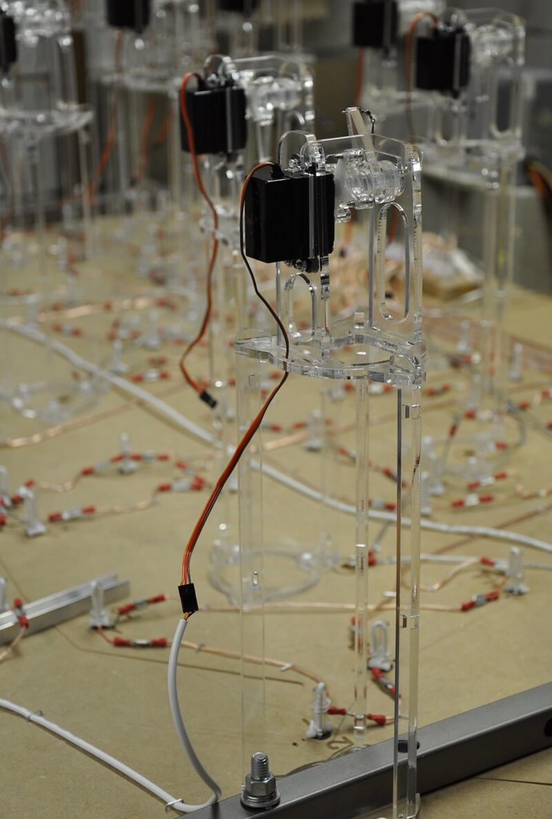The surface is actuated using monofilament attached to small, high torque servos. RGB LEDs above the petal surface can be tuned to provide a wide variety of lighting effects. The MDF soffit was modeled as a network of the stems. The ridges allowed material to be placed where it was structurally needed to keep the petals stable and fixed. The top of the soffit became the circuit board for the LED’s and base for the servo towers.