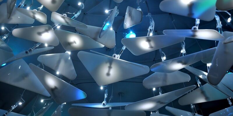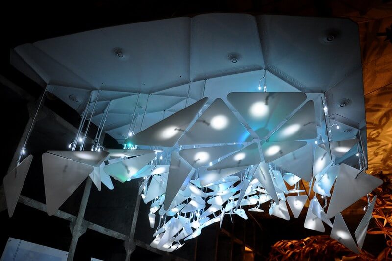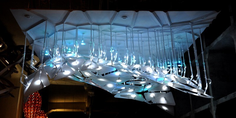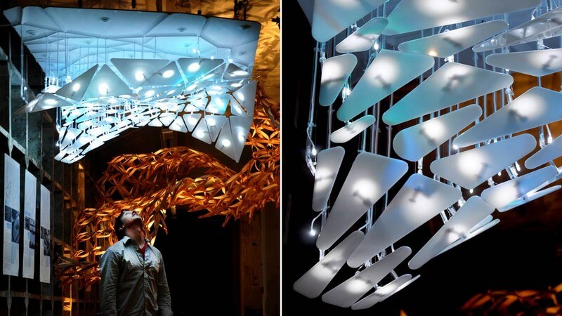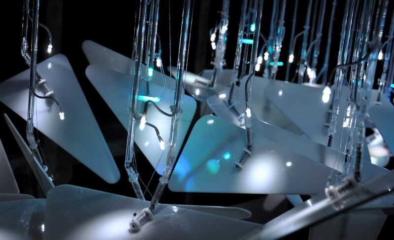 MorphoLuminesence by Project One Studio is a kinetic ceiling prototype that reacts to people standing and moving beneath it. Sensors detect speed and direction of people in relation to the piece. If a user stands still for a long enough period of time, the petals will retract into the completed surface, but once deactivated by the user leaving, the piece opens its pods.