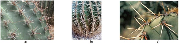 Fig. 3 The barrel cactus (Echinocactus grusonii) a) swollen, b) shrinking; and c) areoles and spines (Source: New York Botanical Garden)