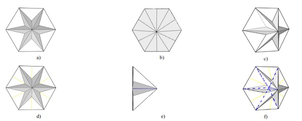 Fig. 4 a) Fully open/ventilating, b) fully closed/shading, c) intermediate/shading ventilating states, d) displacement in y-axis, e) displacement in x-axis, and f) displacement in both x and y-axes of the façade component