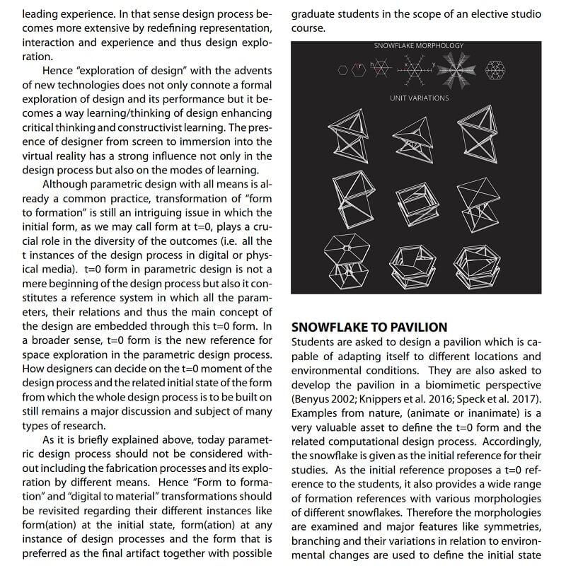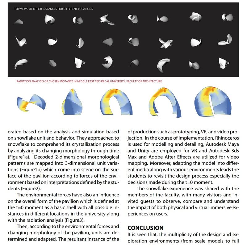 “Exploration of design” in the realm of new technologies does not only connote a formal exploration of design and its performance but it also becomes a way learning/thinking of design enhancing critical thinking and constructivist learning. Within the scope of this study by Arzu Gönenç Sorguç, Çağlar Fırat Özgenel and Müge Kruşa Yemişcoğlu, the multiverse of a form(ation) is explained throughly and examplified through snowflake pavilion which is issued to 4th year and graduate students in the scope of an elective studio course. Snowflake pavillon comprises physical, virtual and mapped reality as a triskelion for immersive experience for visitors.