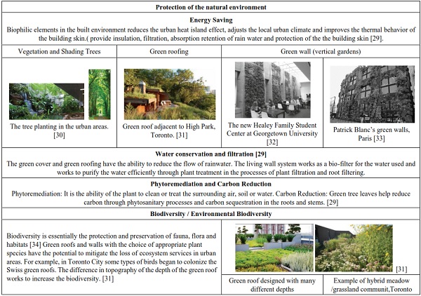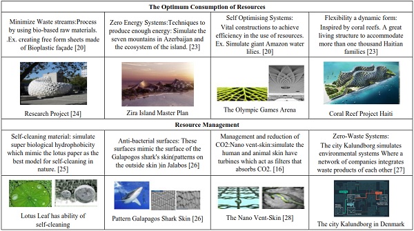 The first strategy is inspired from nature by implementing the Biomimetic design which mimics the performance of nature and provides clean technologies. The second strategy is integrated into nature by using Biophilic design and its role in achieving human well-being and improving their performance.