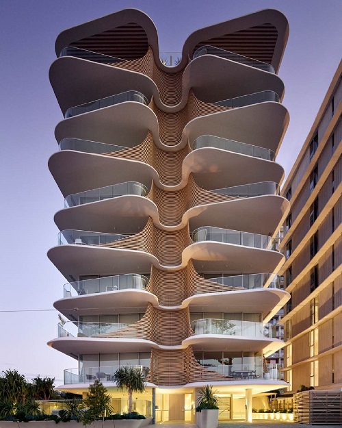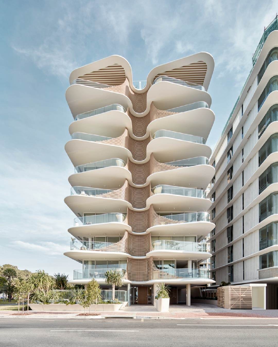 Drawing inspiration from local Norfolk pines, this mixed-use residential project is a sculptural and sympathetic addition to its coastal location in Burleigh Heads (Queensland, Australia). / https://koichitakada.com/projects/norfolk/ ↑
