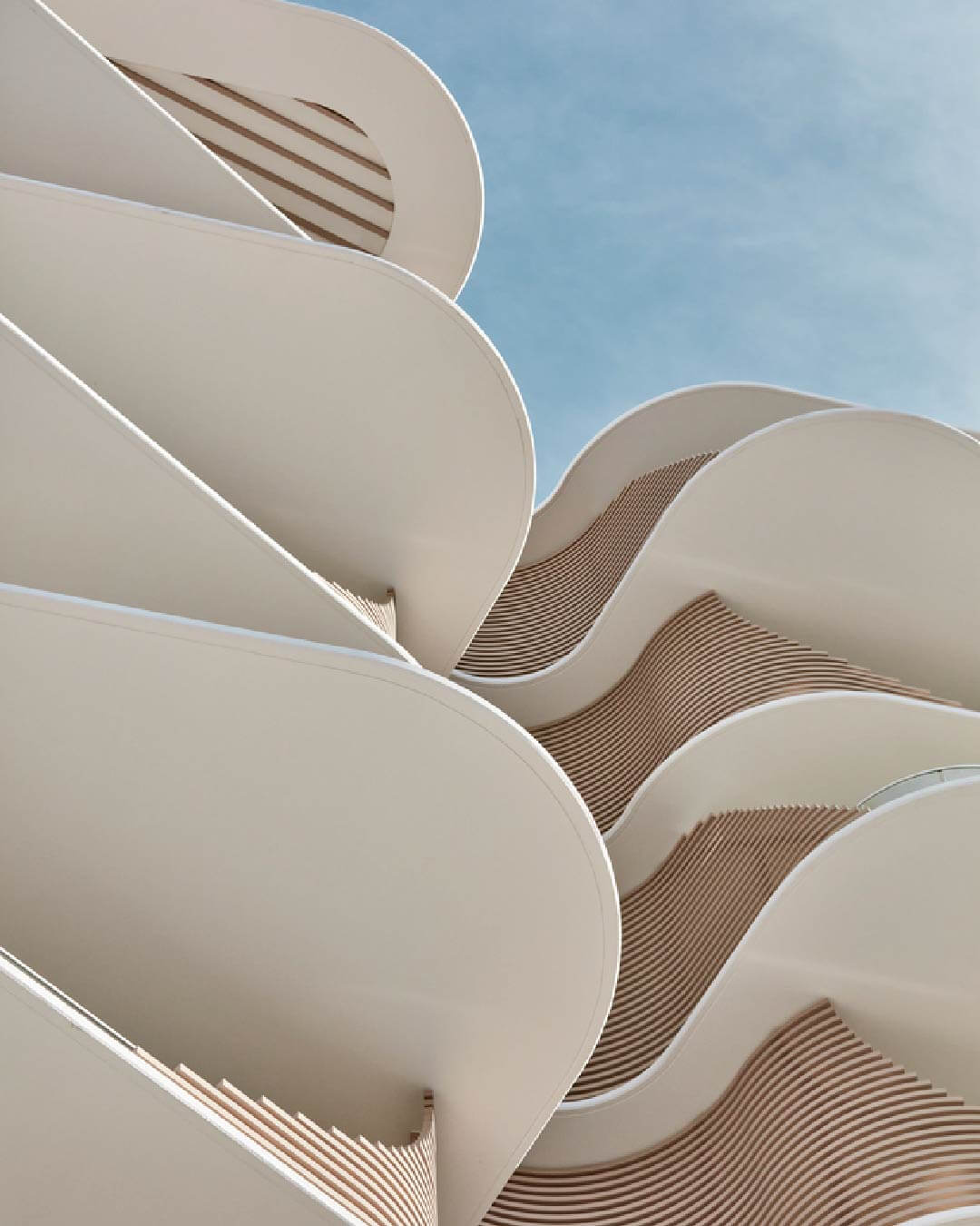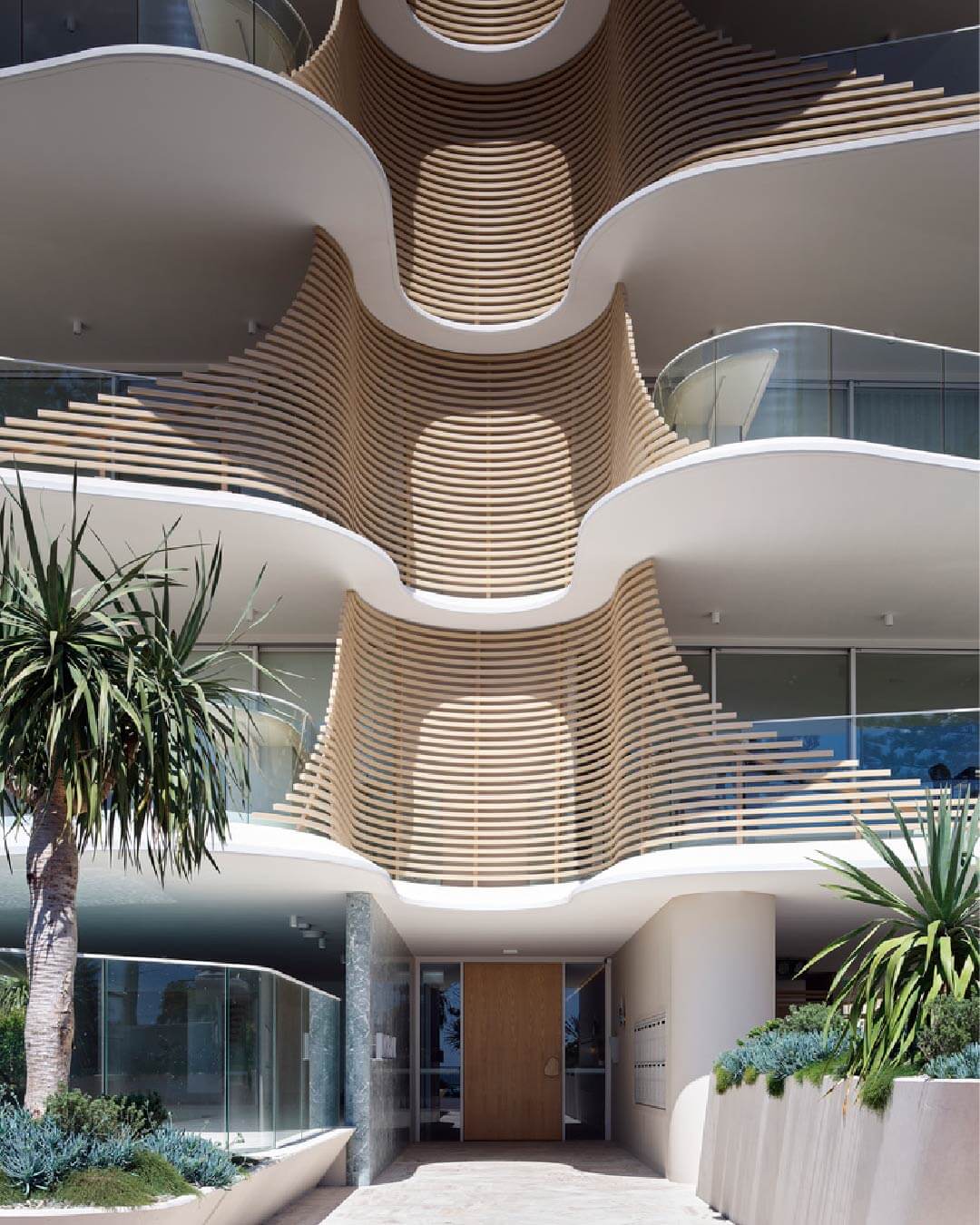 Tapered slab edges project past glazed balustrades and curved line of the balconies to reflect natural and ambient light deep into the apartments.