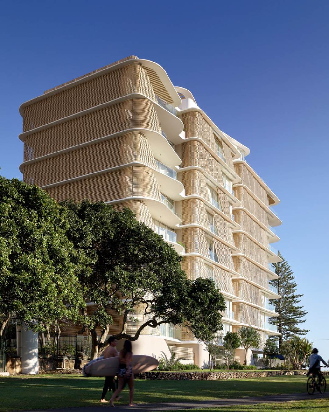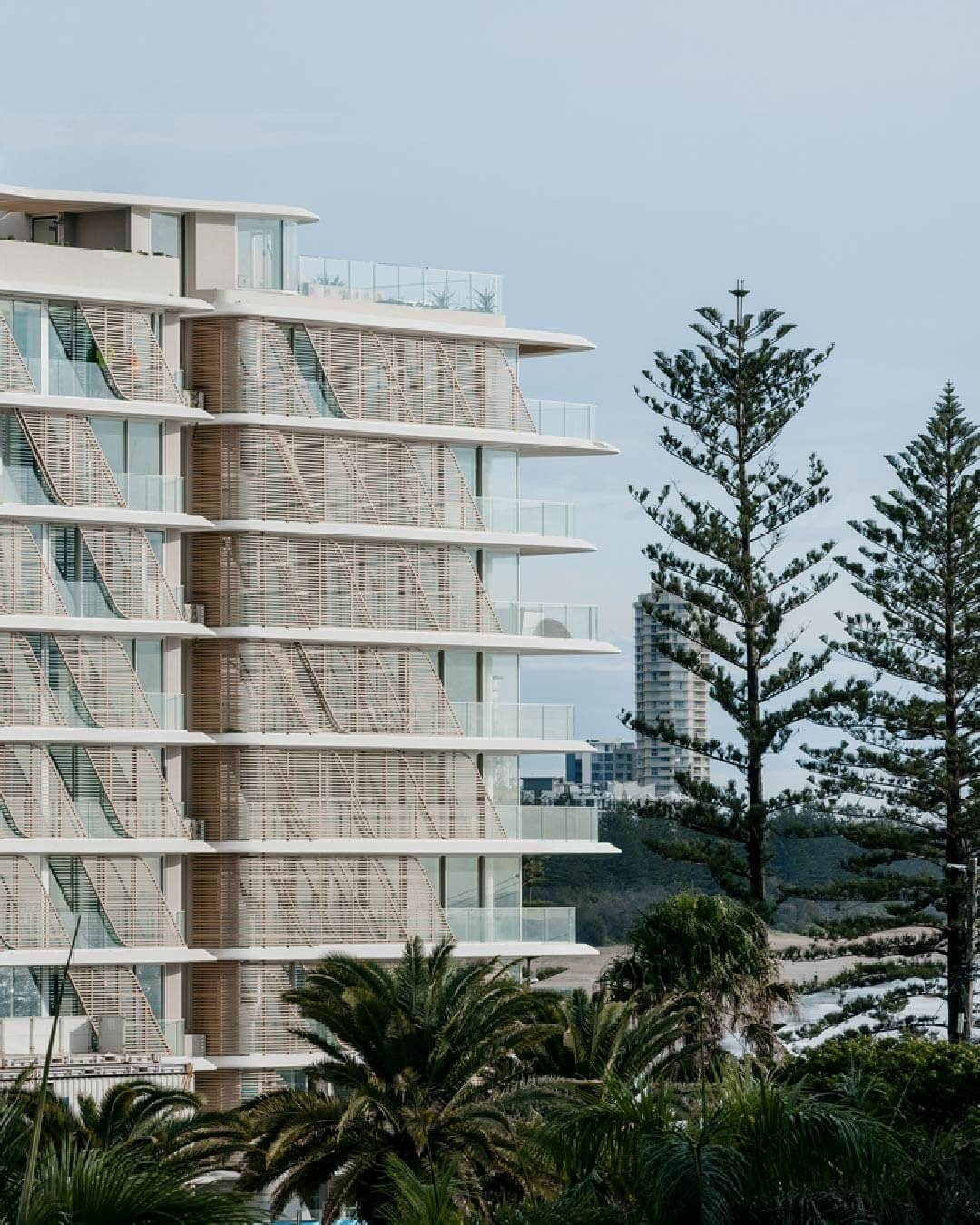Fronting the Southern end of Burleigh Heads Beach, the expansive views up the coast and out to the ocean are framed by heritage-listed Norfolk Pine Trees, from which the project draws inspiration.