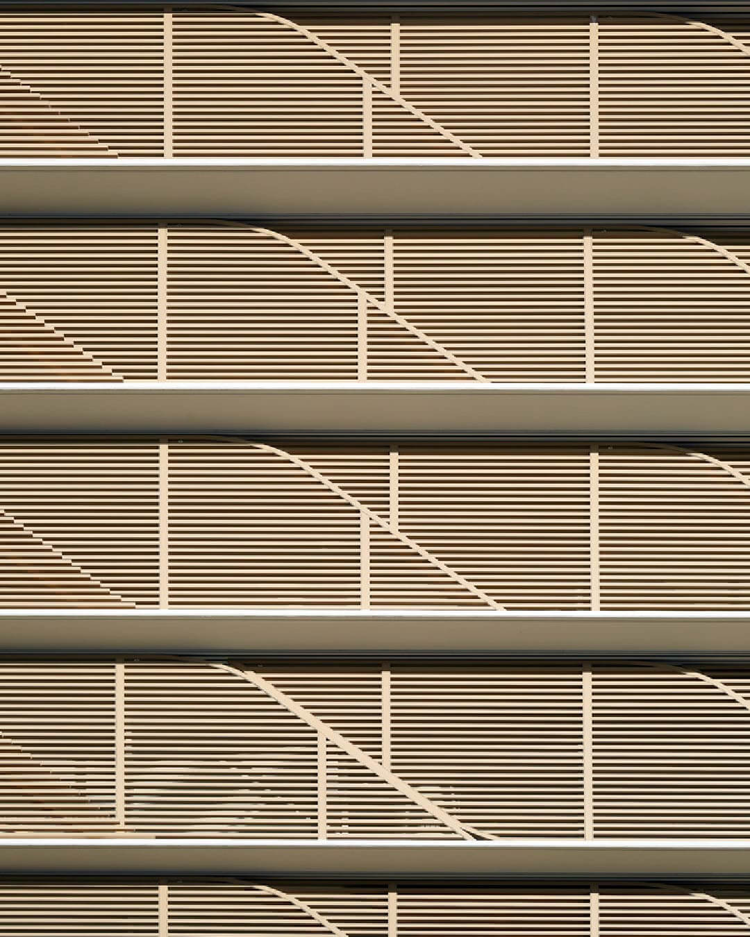 Curved horizontal battens form a central spine of this sculptural building and accentuate the organic expression of the design.