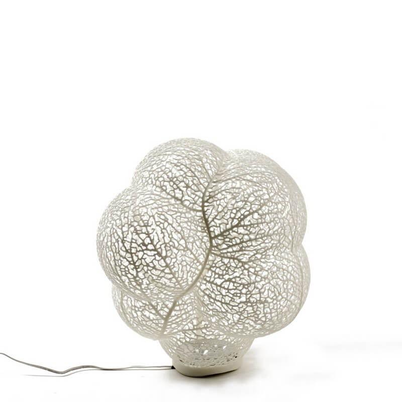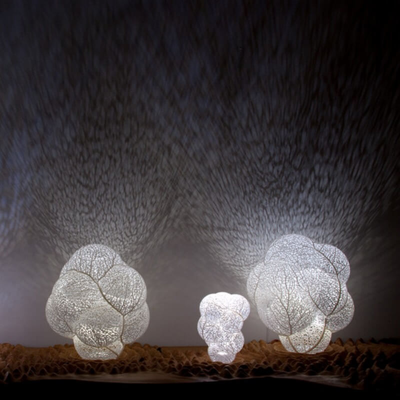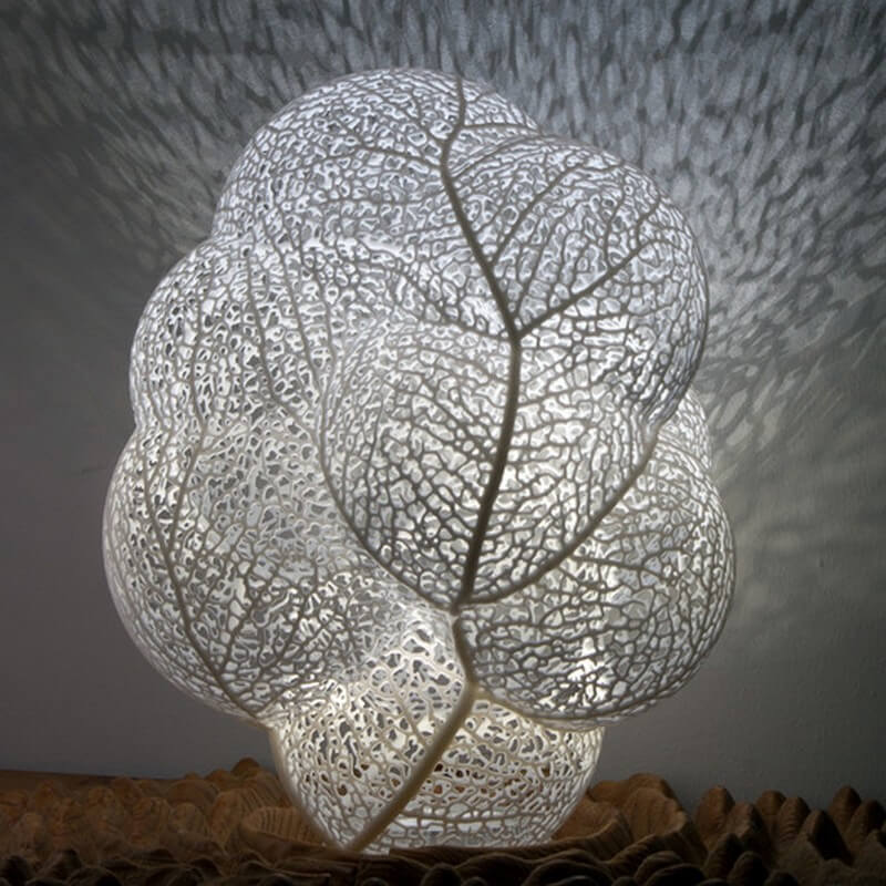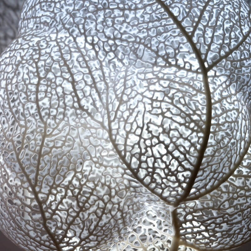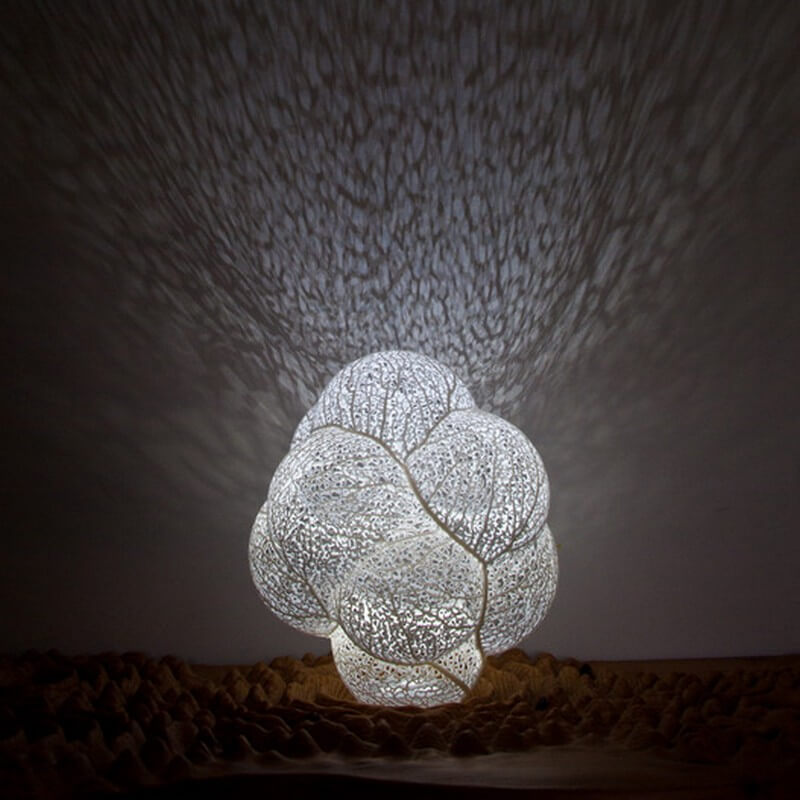 The Orbicular lamp by Nervous System is a series of table lamps based on how veins form in leaves. Each lamp is a completely one-of-a-kind design 3D-printed in nylon plastic with its own unique form and pattern of veins. The lamps are lit by eco-friendly LED’s and cast dramatic branching shadows on the wall and ceiling. The bubbly, globular shapes of hematite and other minerals that grow in a botryoidal habit inspired this sphere aggregation system.