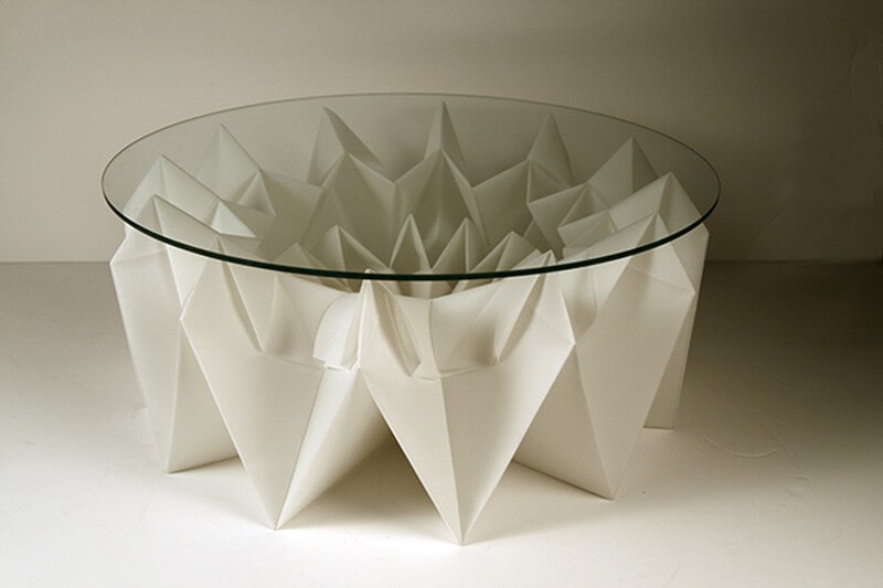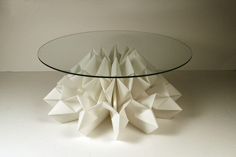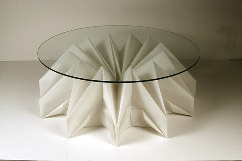 To design a kinetic table Haeyoung Kim chose origami as a concept. Paper contains fibers and they are entangled with each other which make them possible to stay together without any additional medium. Idea of having no joint and still be able to construct a structure is fascinating. By folding papers, it naturally makes joints and holds pieces together. Because of foldability, paper maintains its tensible strength when folded back and forth. Understanding characteristics of papers is critical to make foldable and transformable furniture without glue or joints.