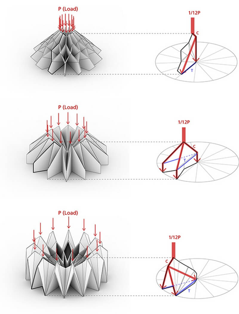 Thickness of paper becomes an issue. The body is combined with 12 individual units which add additional thickness to the structure. The thicker papers are, the less accurate angle, height and width are, and that gives unstable support for structure. Thickness hinders not only a transformation process, but also limits paper choices. Therefore, designer combined units to one long piece of paper and eliminated overlapping (redundant) areas, so that It becomes half length of the original. Combining units saves a great deal of material, and increases accuracy in folding and assembly.