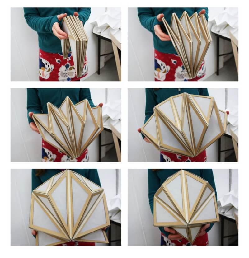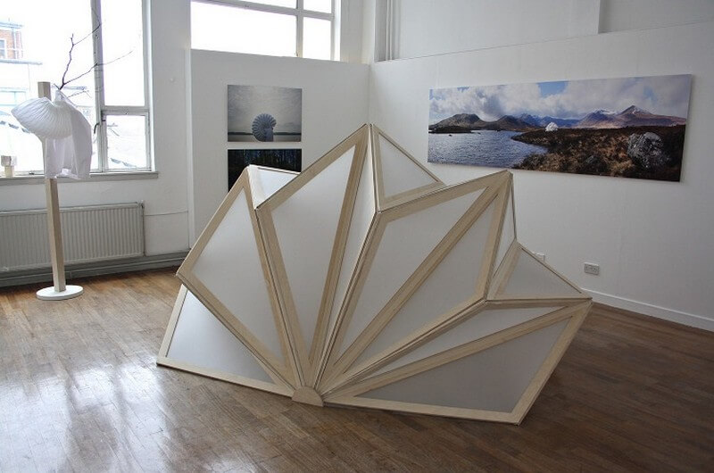 Origami Shelter by Hannah Imlach (birch plywood, ripstop nylon and cotton webbing, 2011) investigates subtle changes in natural light. The sculpture is a portable, foldable space, large enough to fit two adults lying comfortably inside. It is made from identical triangular panels and uses fabric hinges in place of folds.