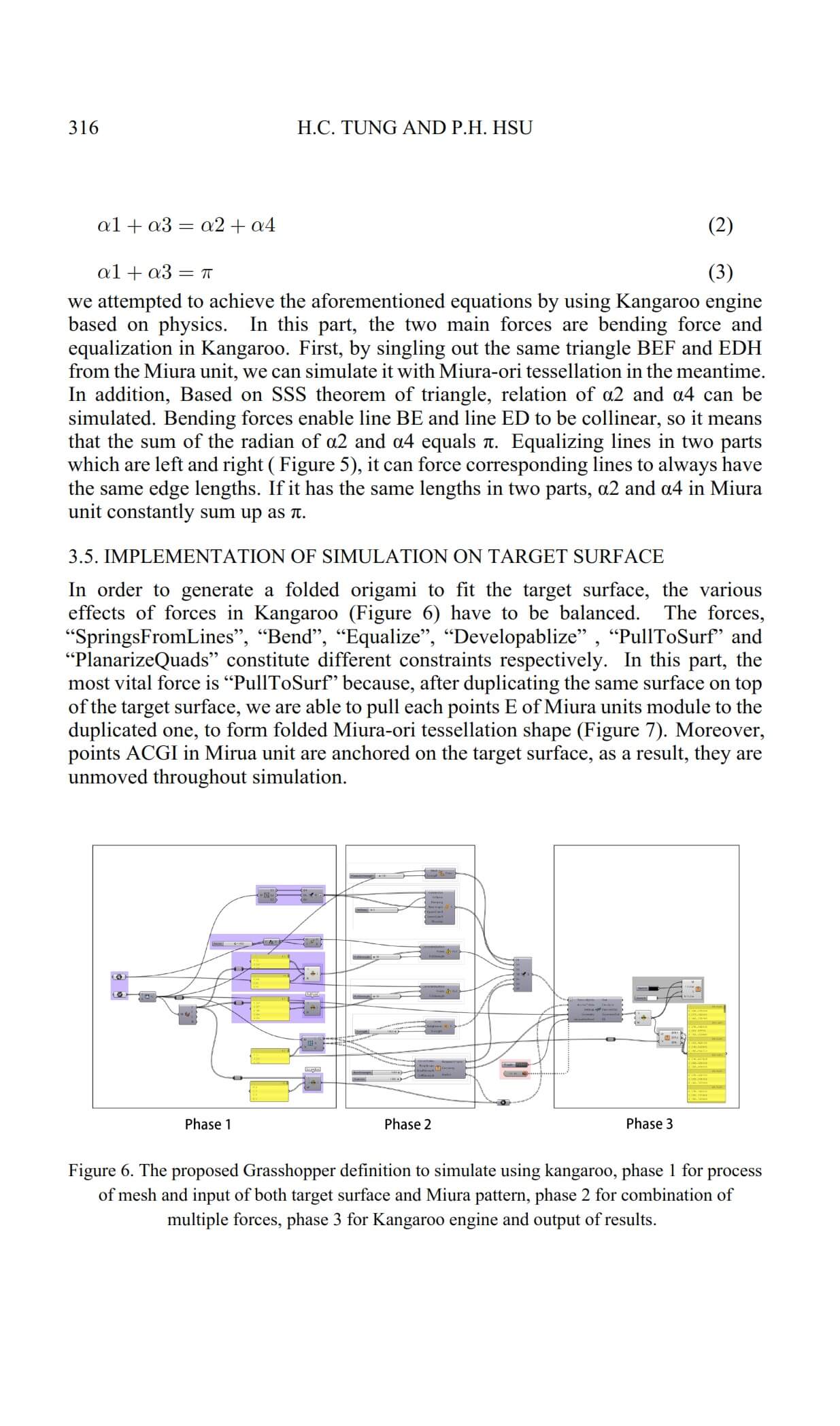 When creating new kinds of origami, people design origami creases pattern on 2D plane. Consequently, people unable to precisely envision the 3D folded shape. However, in architecture, civil engineering and industrial applications, an accurate layout is important. This research by Hong-Cing Tung and Pei-Hsien Hsu is to compile an algorithm for creating origami forms with developability and flat-foldability on the target surface, more specifically, by setting a target surface first, generating a Miura-ori tessellation from the geometric configuration of a target surface.