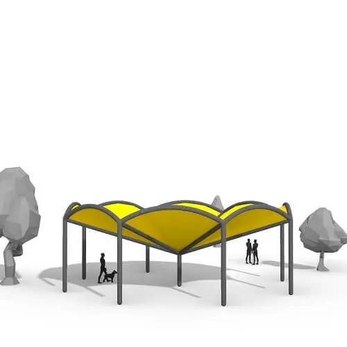 In this grasshopper example file You can design a parametric pavilion by using an arc and deform it along the