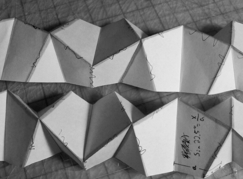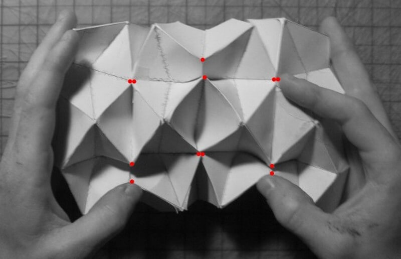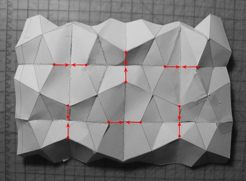 With his first folding tests, Mitch Lorberau mostly worked with printers and physical cuts, in lieu of constructing the grasshopper definition side by side, and limited experience with laser cutting. The pattern was based around a strip module which he replicated and offset to form a larger pattern. At first the sheet was quite resistant to folding, but then he realized he was pushing the wrong modules- by shifting his technique he realized the points marked in the image can converge to an almost touching position.