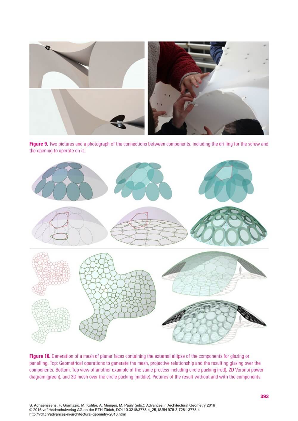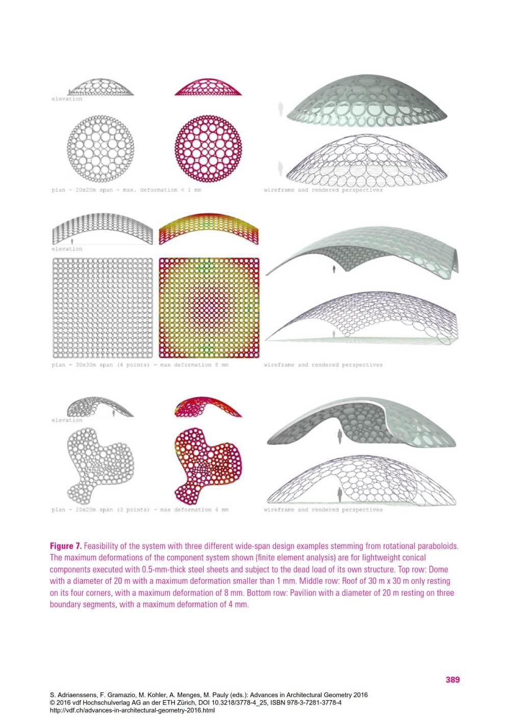 Finally, the ellipses are materialised with components composed of three truncated conical surfaces which might be made up of several laminar materials. The geometry and economy of material, the good structural behaviour, the simple solution for fabrication and assembly and the tests on a full-scaled prototype prove this component to be an efficient self-supporting system for wide-span structures against the use of solid boundary rings, not only for rotational parabolic domes, but also for a possible translation to other types of surfaces.