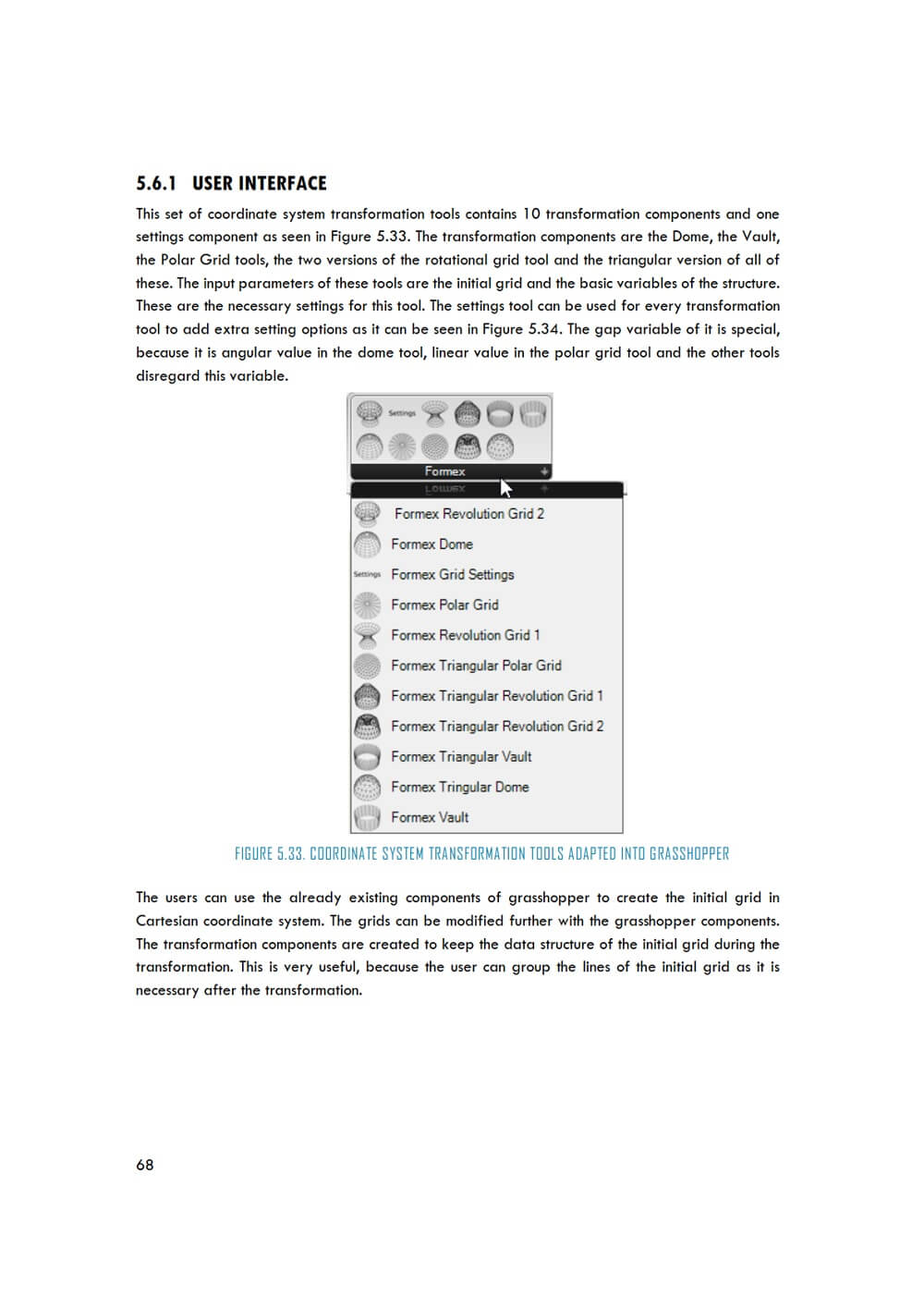 Author researched and classified the parametric design tools and she also assigned its connections to traditional architectural design. She created a plug-in for Grasshopper, the parametric software she primarily use, which contains coordinate system transformation tools partly based on another similar tool, Formex Algebra. She also added more tools based on the specifications of parametric design.