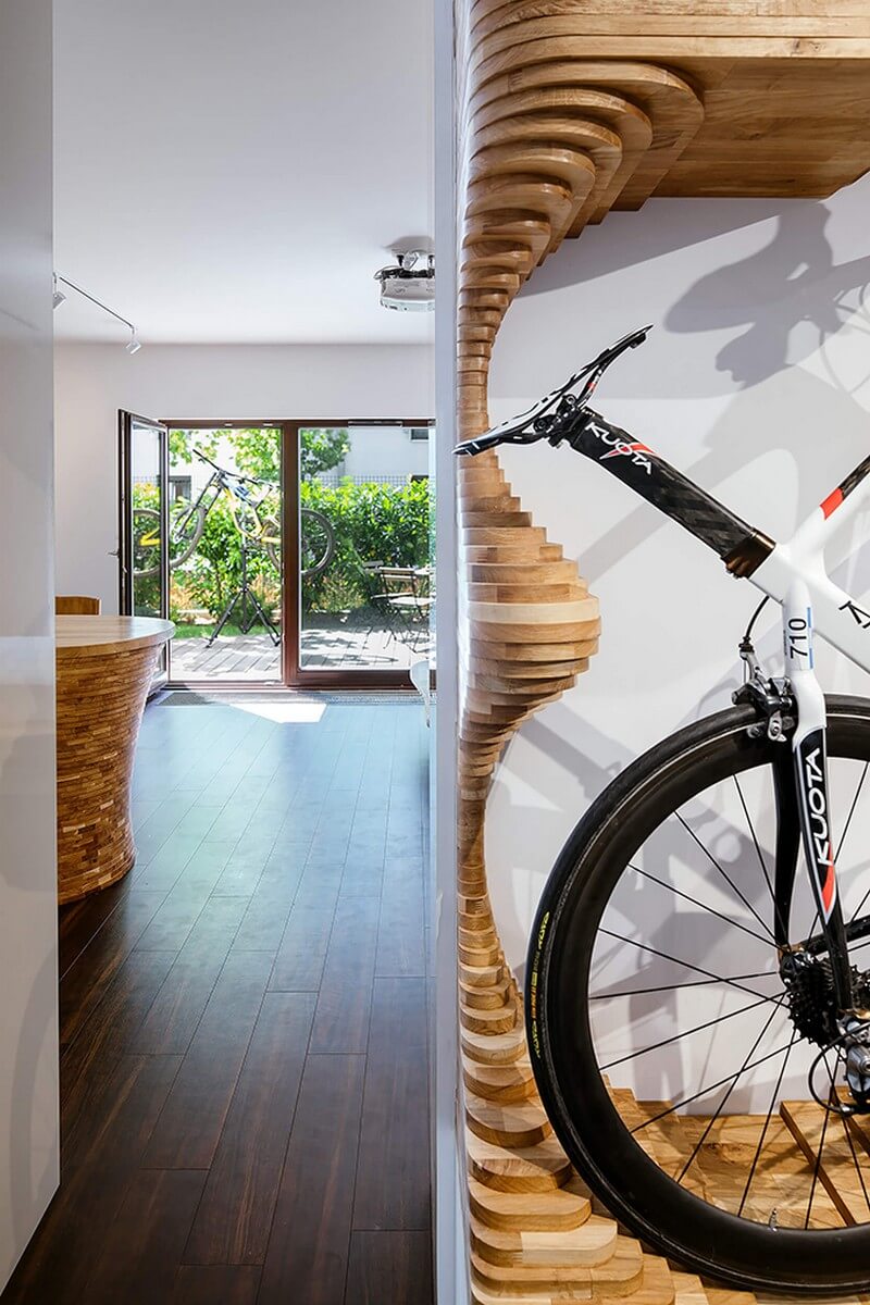 In the case of a entrance hall a part of the atypical structure is used to place as well as expose an important part of the client’s life – a racing bike. The whole space of the apartment, or even service rooms and outdoor terrace are designed in a simple material and color combination, where the dominant white materials are complemented by oak joinery elements. The center of the space consists of white built-in cabinets, which are designed with an emphasis on simplicity and unobtrusiveness of the entire structure.