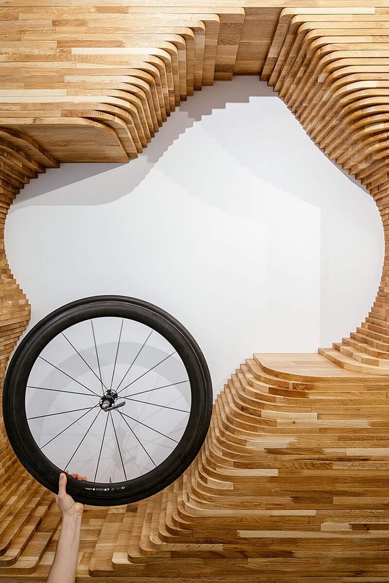 This becomes a bright exhibition space through which the wooden interior elements are placed and thuscreating a layer of a certain interior landscape. Take a look at the complete story after the jump.