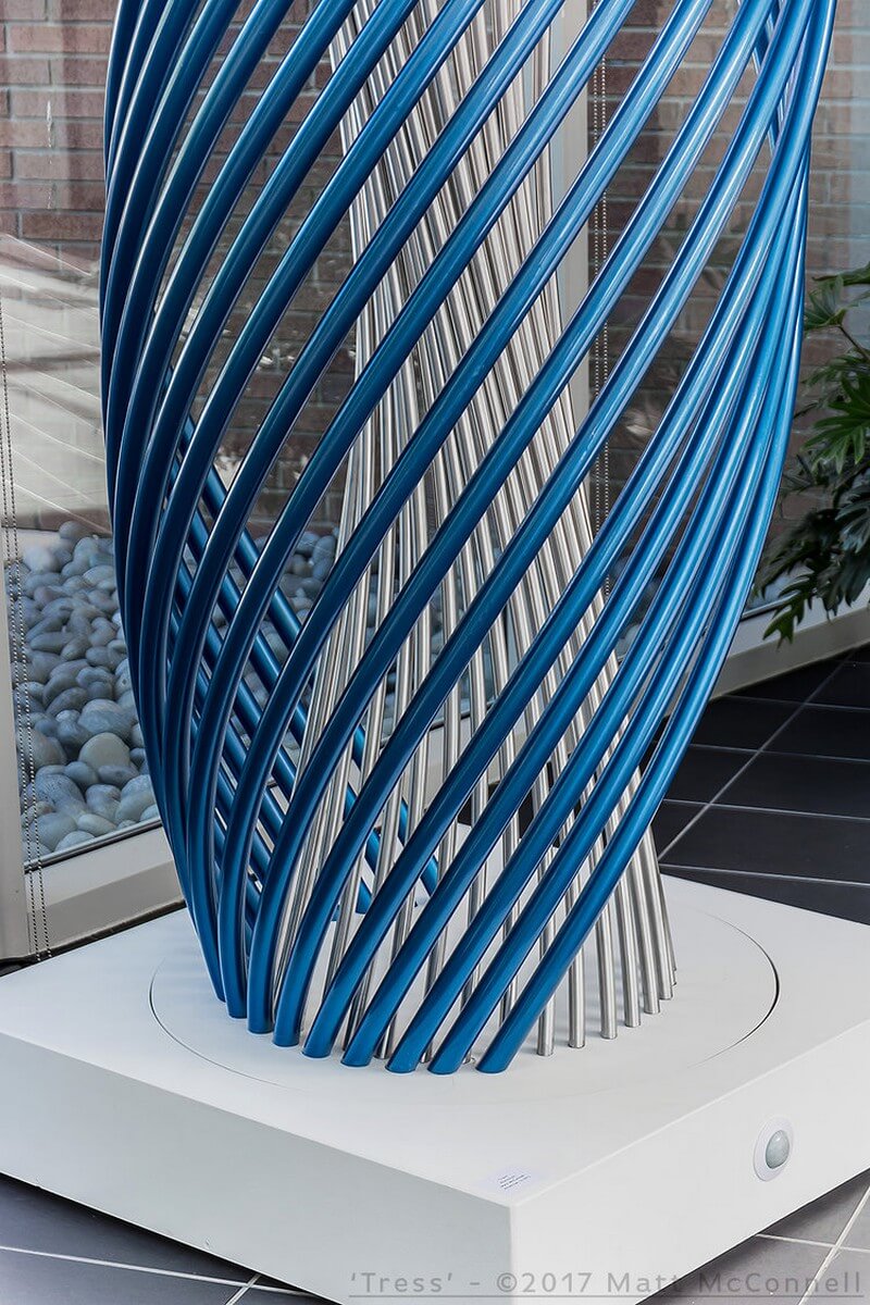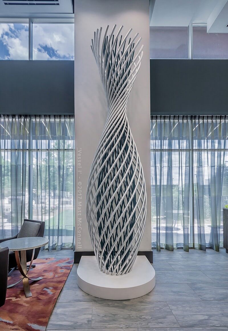 Tress, a 12′ x 2’6″ x 2’6″ vessel inspired sculpture made from Aluminum with catalyzed urethane finish.