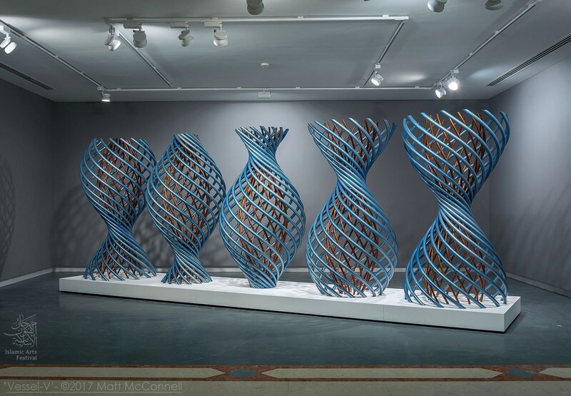 Vessel V, Five vessel forms in infinite series, each part of a larger vertical column made from aluminum. it’s created for the 2017 Sharjah Islamic Arts Festival at the request of the Department of Culture – Sharjah, United Arab Emirates.