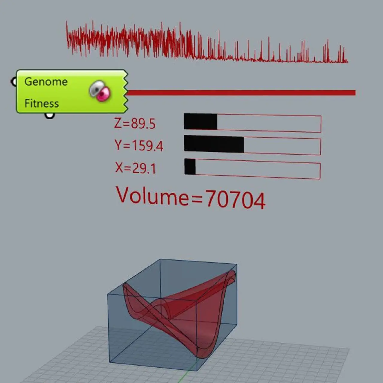 In this definition you can learn how to optimize a bounding box of a solid by using Galapagos and by rotating it around the x,y,z axis. Finally you can use a few simple commands to visualize some of the Data in the rhino viewport.