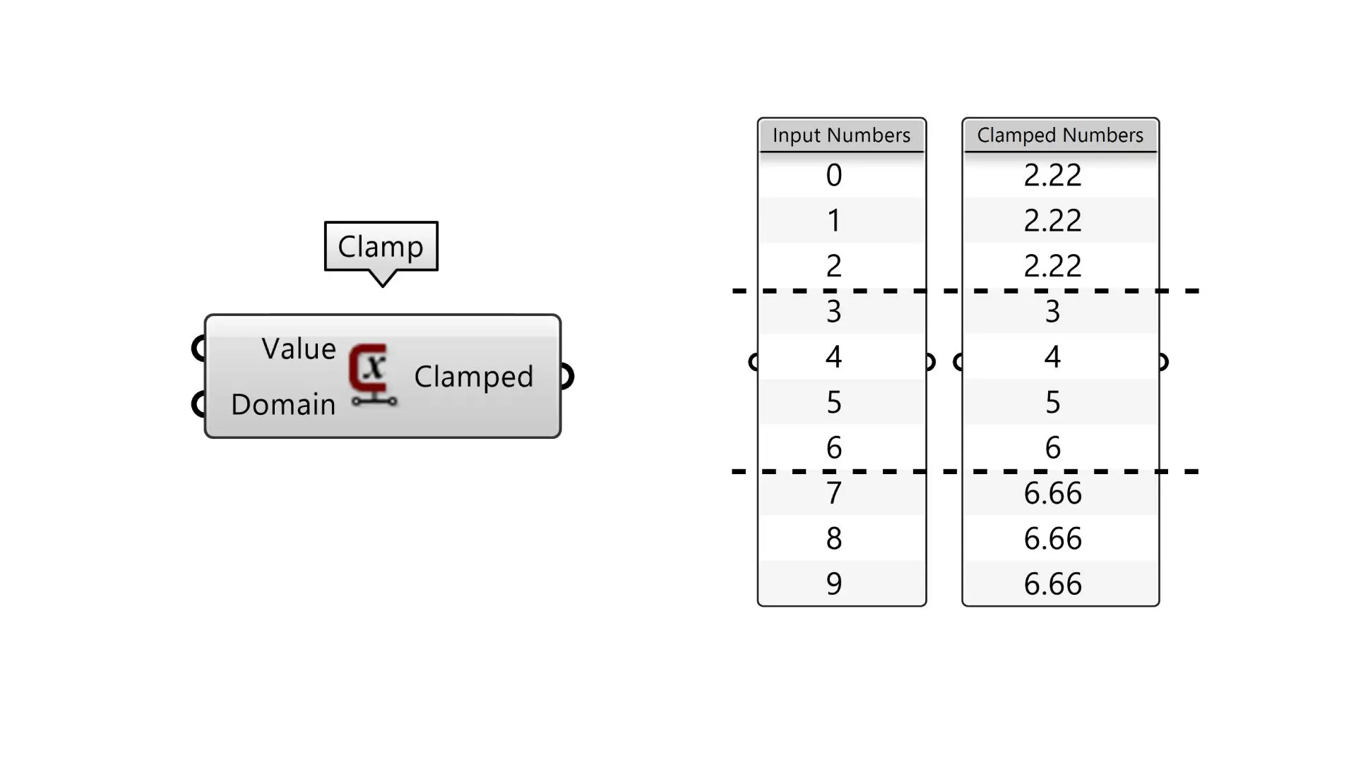 The Clamp component, introduced in Rhino 8, helps you constrain numbers within specific lower and upper limits.