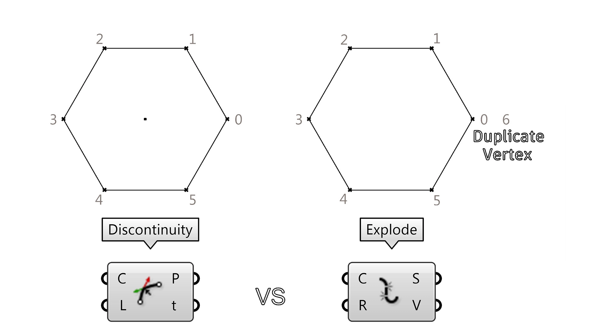 In this Grasshopper example, the Discontinuity and Explode Curve components are compared to demonstrate their differing outputs for a closed polyline.