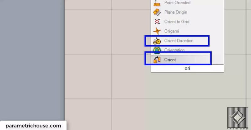You can simply double-click on the canvas and search for “Ori”. There are two tools for orienting. One is Orient which actually transforms the geometry from a plane to another plane. Second is the “Orient Direction” which we will be talking about.