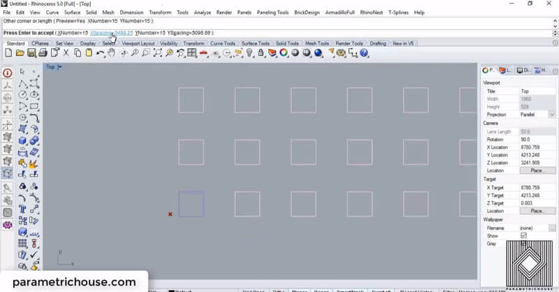 To start from scratch we can draw multiple geometries to see the orienting effect. We can easily array a rectangle or a square to have a grid of curves. I gave the array a 15 for row and column and a 1 for z-direction. The spacing of the squares is 5000 for each direction.