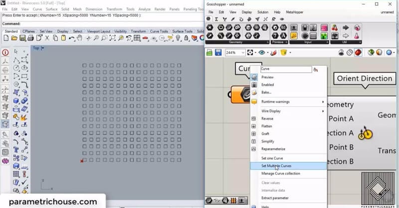 After creating the squares we can simply put a curve on the canvas (Params>Curve) and right click on it and choose “Set multiple curves” to import them into Grasshopper.