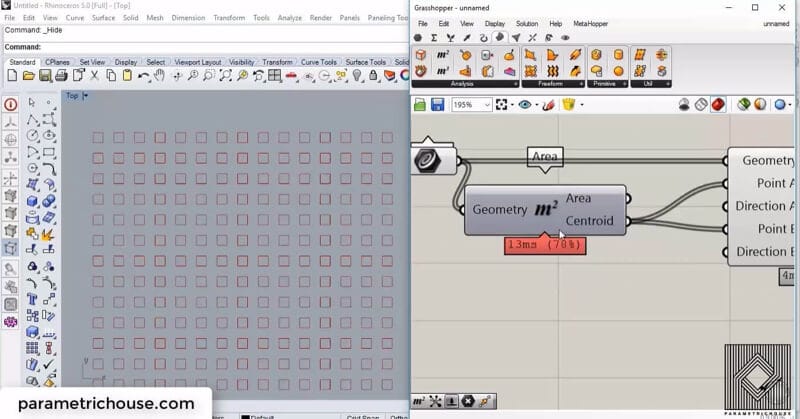 Later we need to define the Point A as the reference point and Point B as the target. Let’s assume that we don’t want to move the squares. In this case, both of the inputs should be the same! We can use an “Area”(Surface>analysis) to extract the squares centroid. You can also use “polygon center” (Curve>analysis).