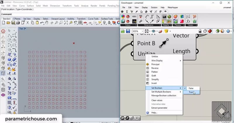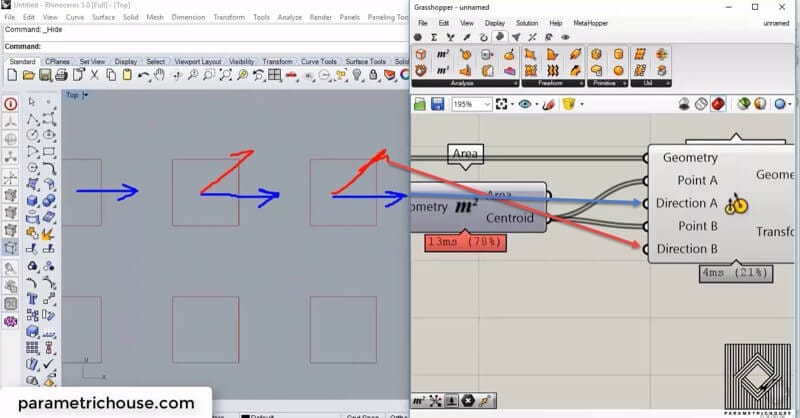 To see the rotating squares, we should define “Direction A” and “Direction B”. By defining an “X vector” (Vector>Vector) we can say that we are using the x-direction as the turning handle of geometry (the blue vectors). If we define the red v