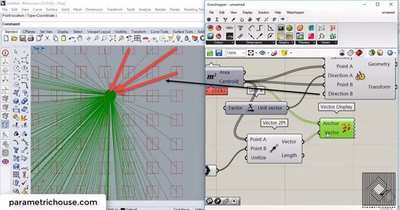 By using a point we can rotate the squares towards it. We use a “Vector 2PT” (Vector>vector) to easily define a target direction by two set of points. The start of the vector is the centroid of the squares and the target point is the point we defined earlier.
