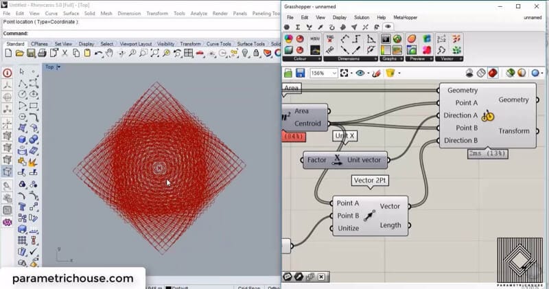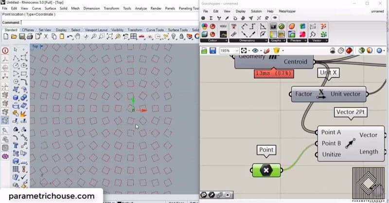 The problem is that “vector 2pt” will give us a vector with a length equal to the distance between the point and the centroids. And because the “Direction A” was a unit X vector, Grasshopper will compare the length of the vectors to define the scale factor. we can easily right click on unitize and set it to true to make the squares the same size.