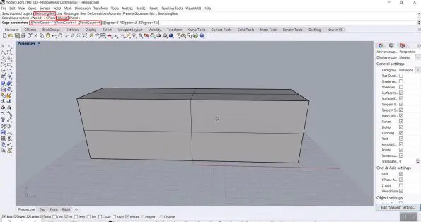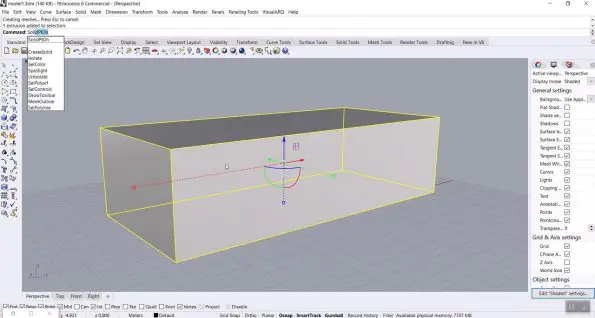 First step of this parametric bench tutorial is modeling the solid. In order to do so we are going to draw a box in rhino. If we want to be able to change the form of the box, we can select it and use “SolidptOn” Command.