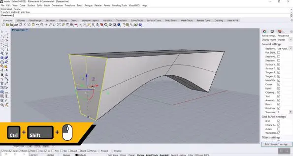 To give this form some stability we can extrude both ends of the bench in the X-direction. In order to do so we can hold Ctrl and Shift and click on the surface we want to extrude. Then we can use gumball, click on that small circle in the X direction and give it the amount of extrusion we need.