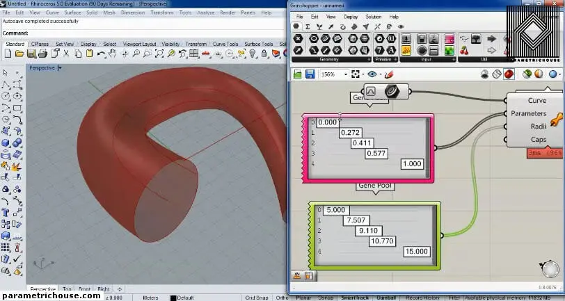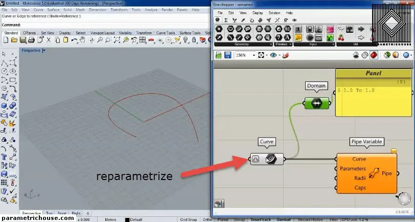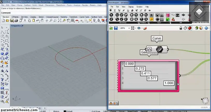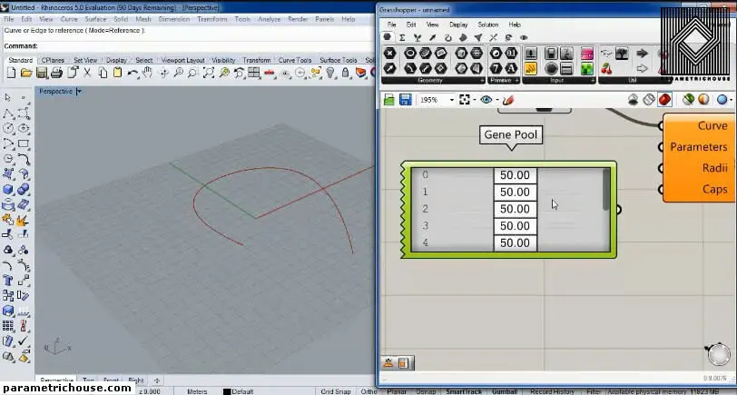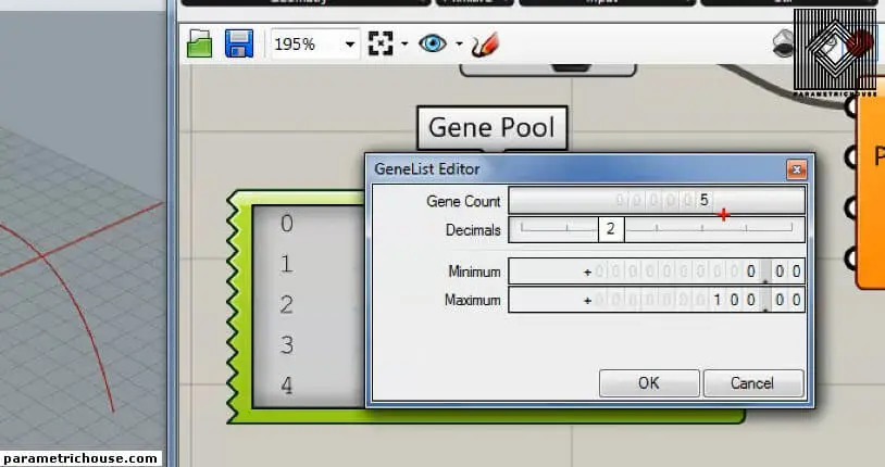 The next input is the Parameters. these are the locations which you want to change the radius of the pipe. Use a “gene pool” (Params>input) to produce several parameters. you can double click on the “gene pool” and change its domain to 0 and 1. change the numbers so that they cover from 0 to 1.