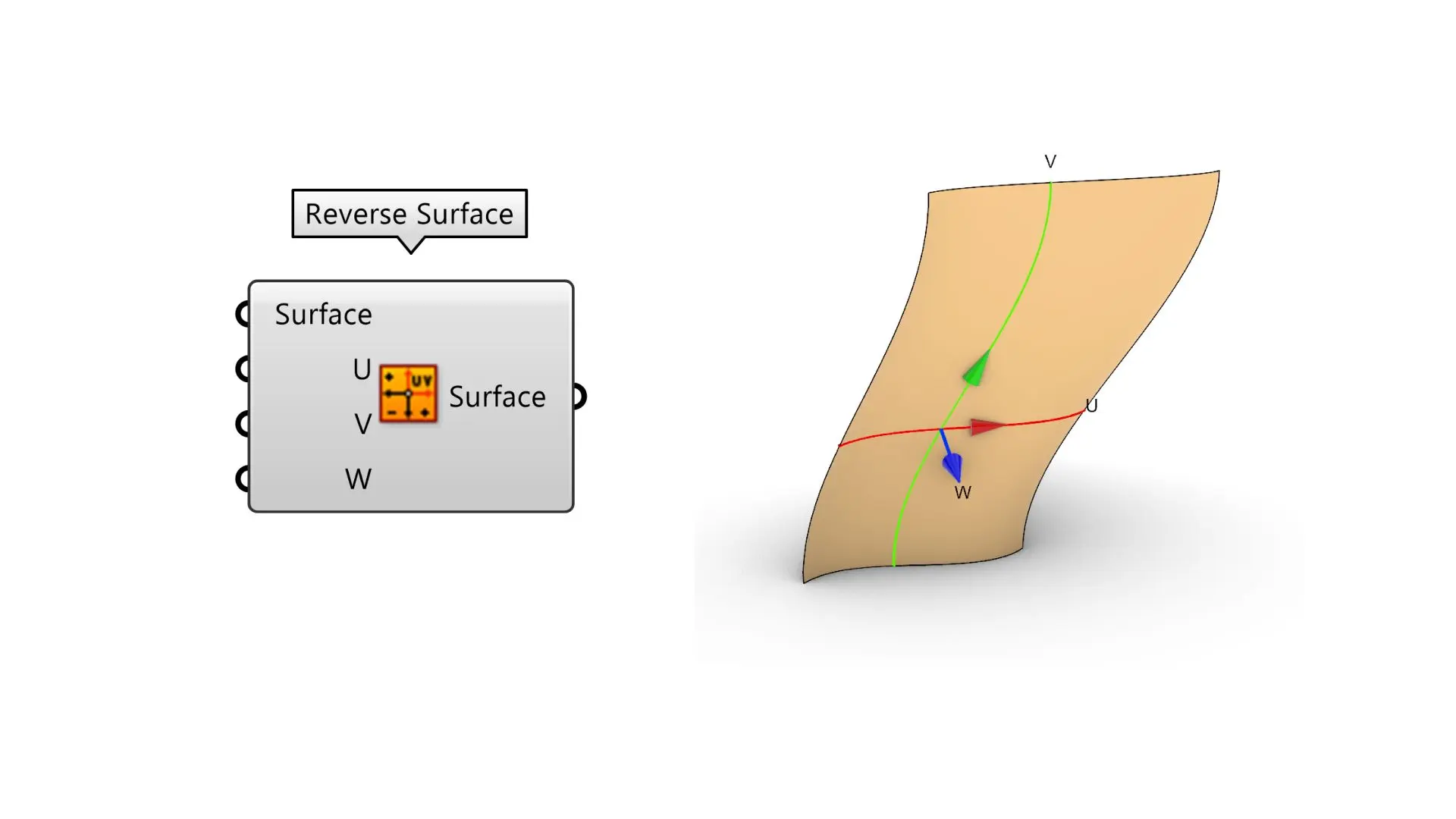 The Reverse Surface component, introduced in Rhino 8, allows you to reverse the U, V, and Normal directions of an input surface.