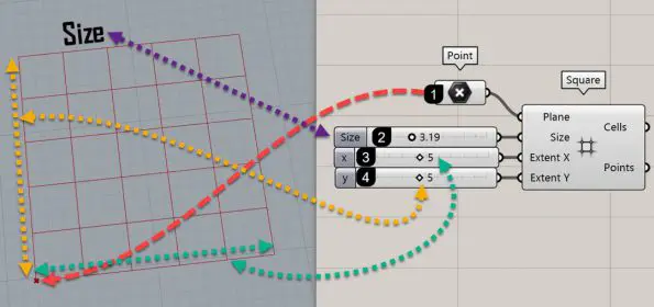 Finally give number sliders to the Size for the size of the grid cells, Extent X for the number of cells in the X direction, and Extent Y for the number of cells in the Y direction.