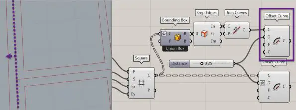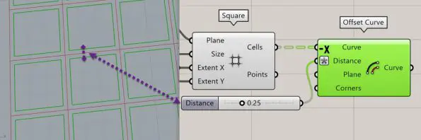 The next step is to offset the square cells inwards so we can give the shadow some thickness. the “Offset Curve” component from the “Curve” menu and the “Util” submenu can do this. Be sure to give an “-x” in the expression of the “Distance” input so the curves don’t offset outwards.