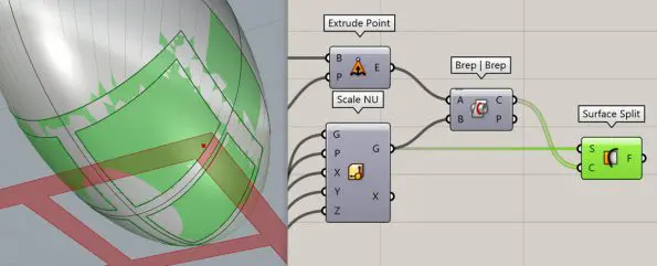 Because sometimes there will be two sets of intersection curves we have to take additional steps to pick up the lower part but basically, we can always split the base surface with the curves by using the “Surface Split” Component.