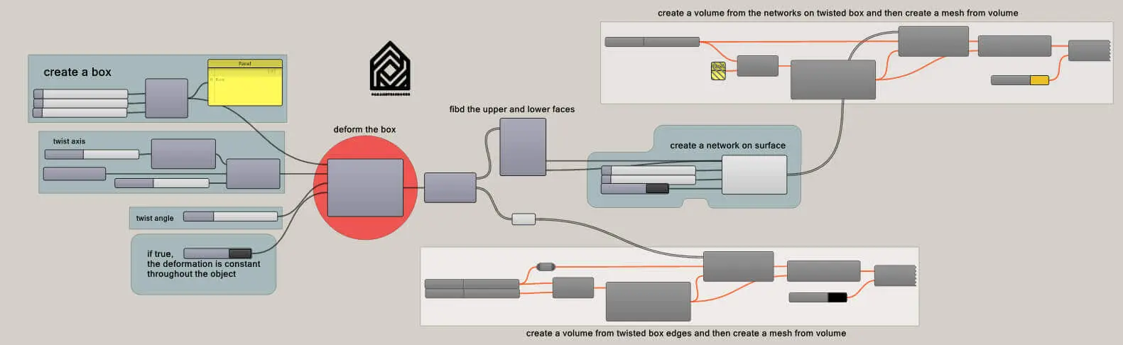In this grasshopper example file, you can twist a network of patterns by rotating it around a parametric axis.