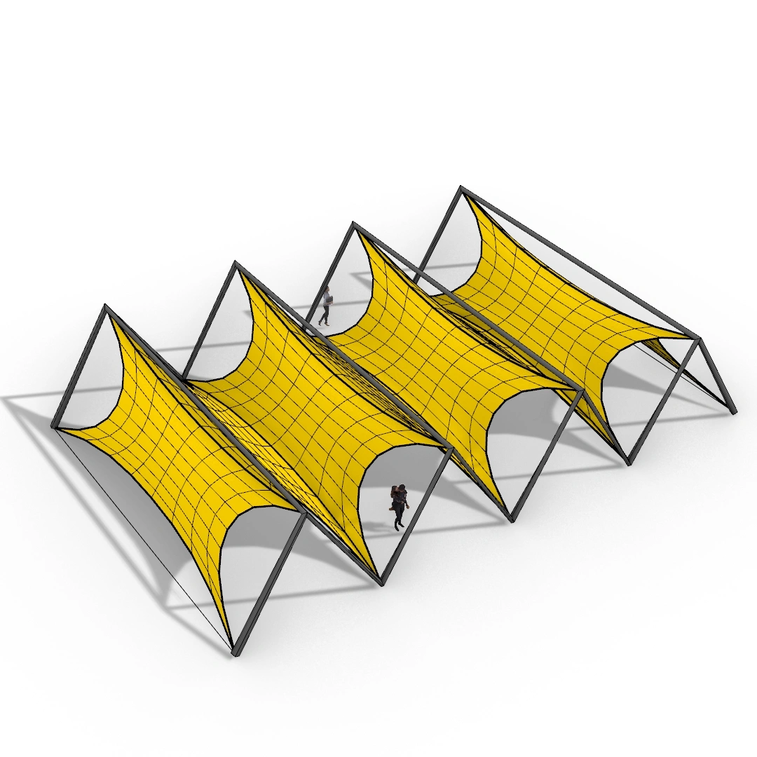 In this Grasshopper example file, you’ll learn how to model and simulate a zigzag tensile entrance/corridor using Kangaroo and dynamic relaxation method.