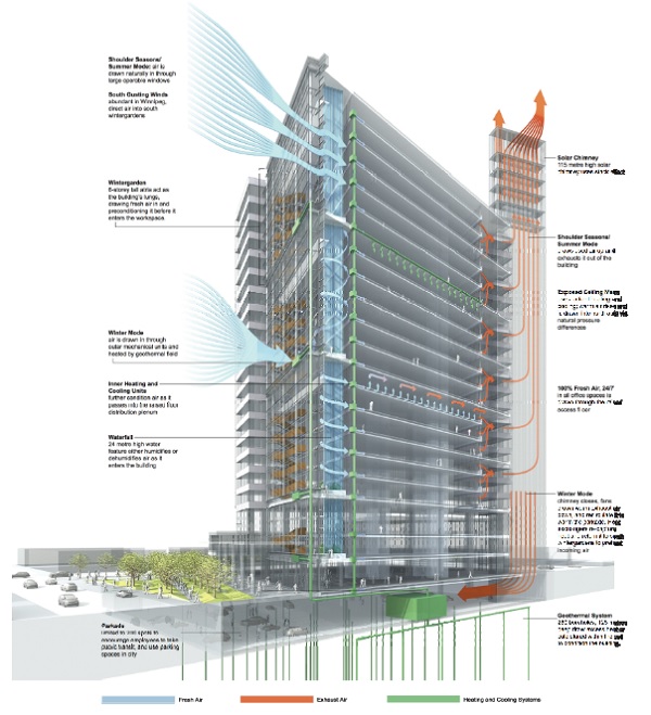 Cantilevered Louvers, Double Skin Facades and Hybrid Conditioned Atria are representative of this new paradigm as is the use of Responsive Technologies to optimize their behaviors.