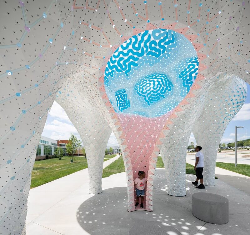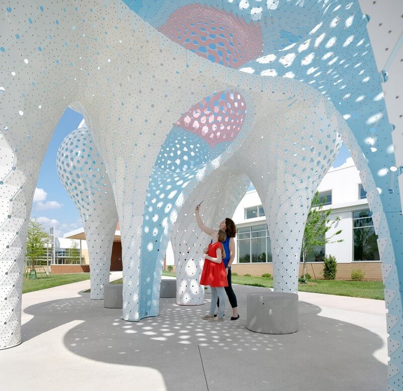 Inside, sunlight is filtered in geometric patterns and shadows are cast. The structure offers relief from the strong North Carolina sun in summer months. Seating areas are incorporated within the legs of the volume, revealing contrasting hues of pink and blue.